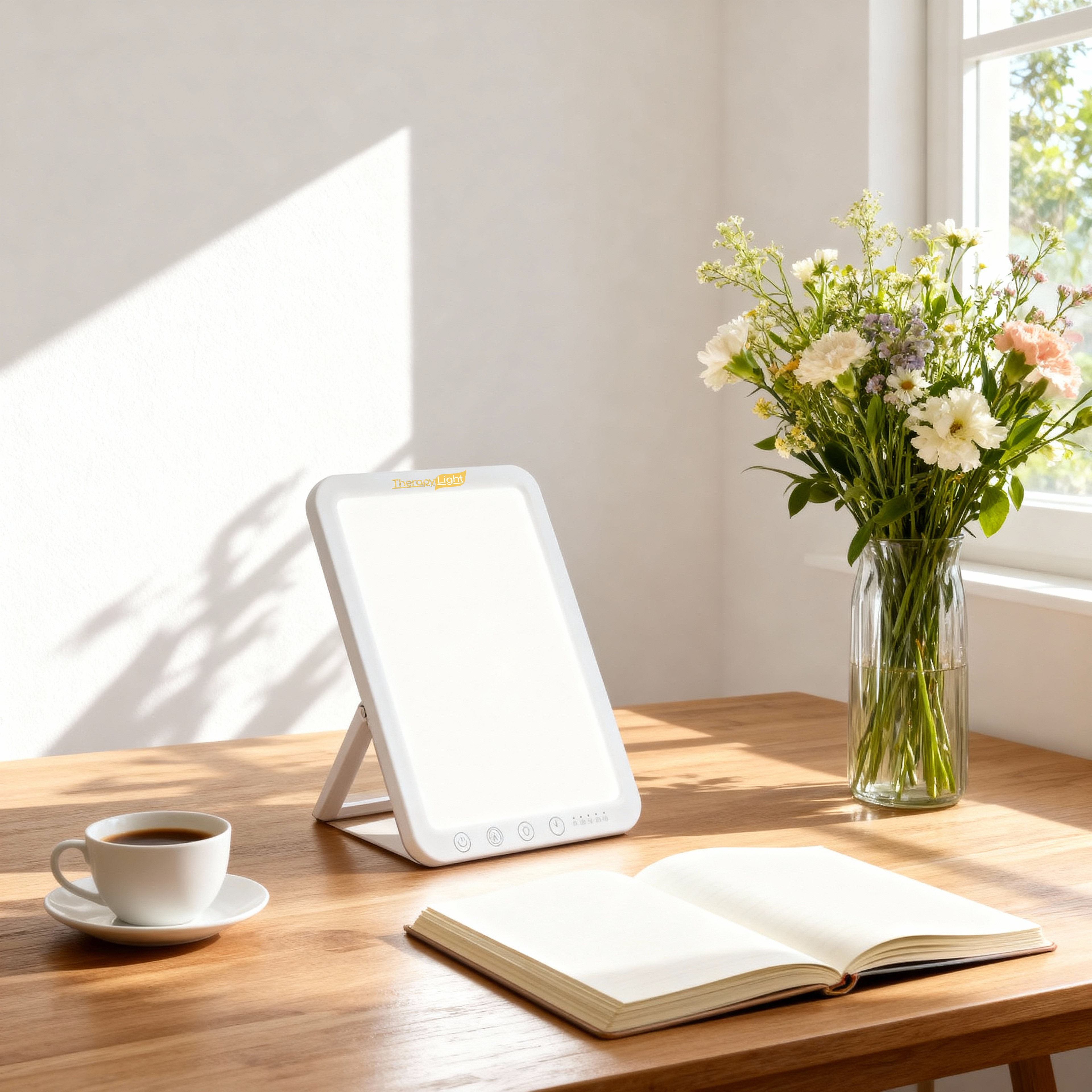 A LED light therapy lamp delivering up to 10,000 Lux, designed to replicate natural sunlight and improve mood, energy, and sleep, UV-free and flicker-free.